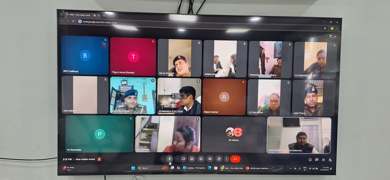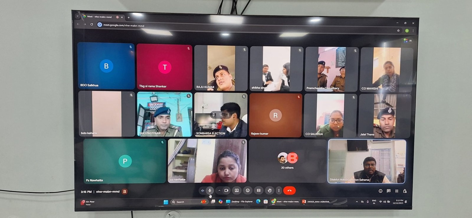 सहरसा। दिनांक 12/12/25 को जिलाधिकारी सहरसा एवं पुलिस अधीक्षक सहरसा की अध्यक्षता में जूम एप के माध्यम से एक महत्वपूर्ण समीक्षा बैठक आयोजित की गई। बैठक में भूमि विवादों के त्वरित निष्पादन, जिले की विधि-व्यवस्था की वर्तमान स्थिति, भू-समाधान पोर्टल पर लंबित प्रविष्टियों, मद्यनिषेध अभियान की प्रगति तथा NCORD के माध्यम से नशीली दवाओं पर नियंत्रण जैसे अहम विषयों पर विस्तृत चर्चा की गई।